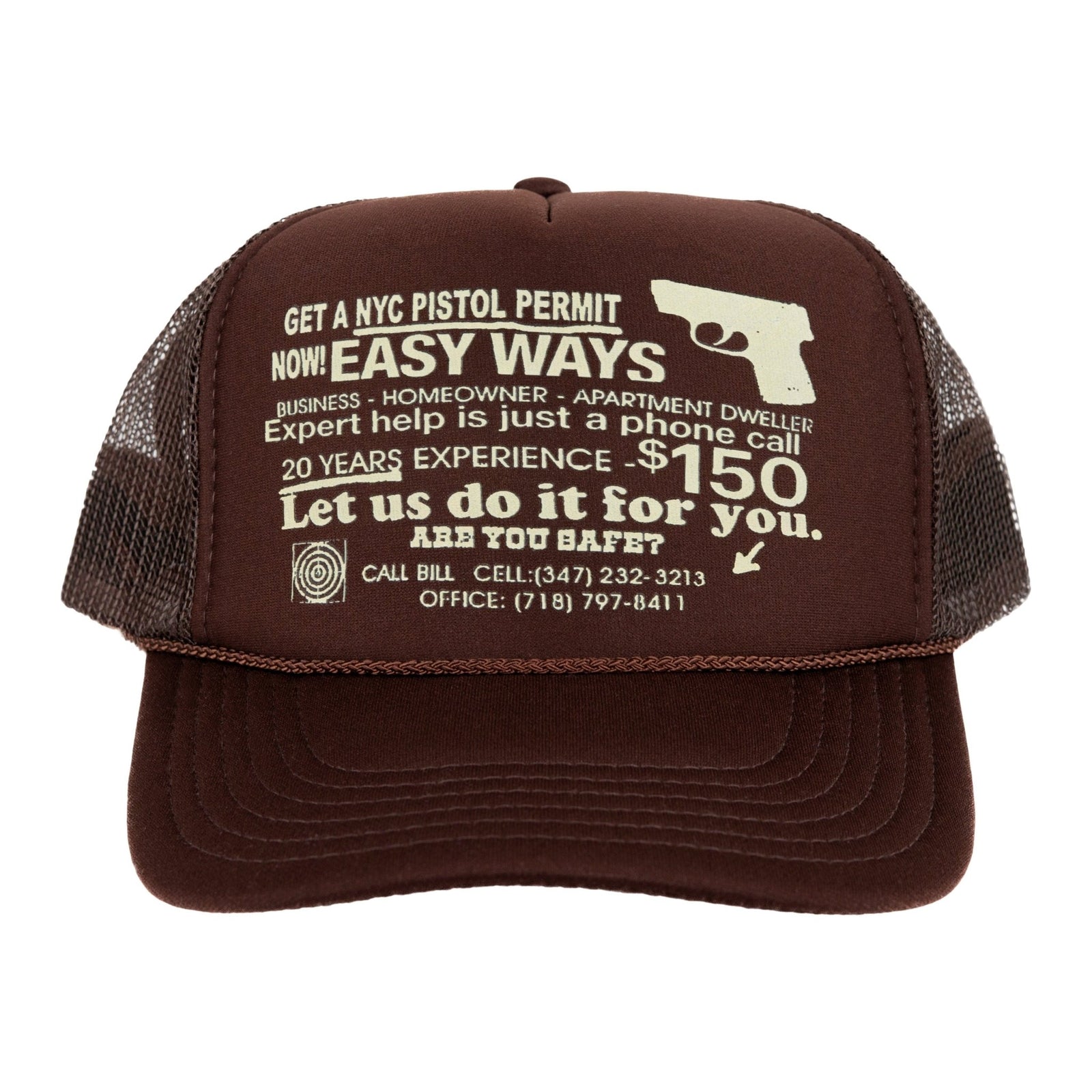 - Brown trucker hat with beige graphic showing how to purchase a pistol.