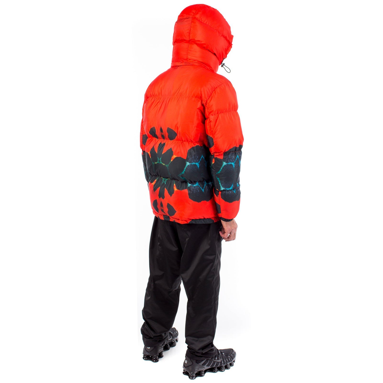 Insulated puffer jacket with bright red print inspired by the poison arrow dart frog. The jacket fully zips to cover the neck area and features a detachable insulated hood. Waterproof zippered hand pockets and front breast pocket.