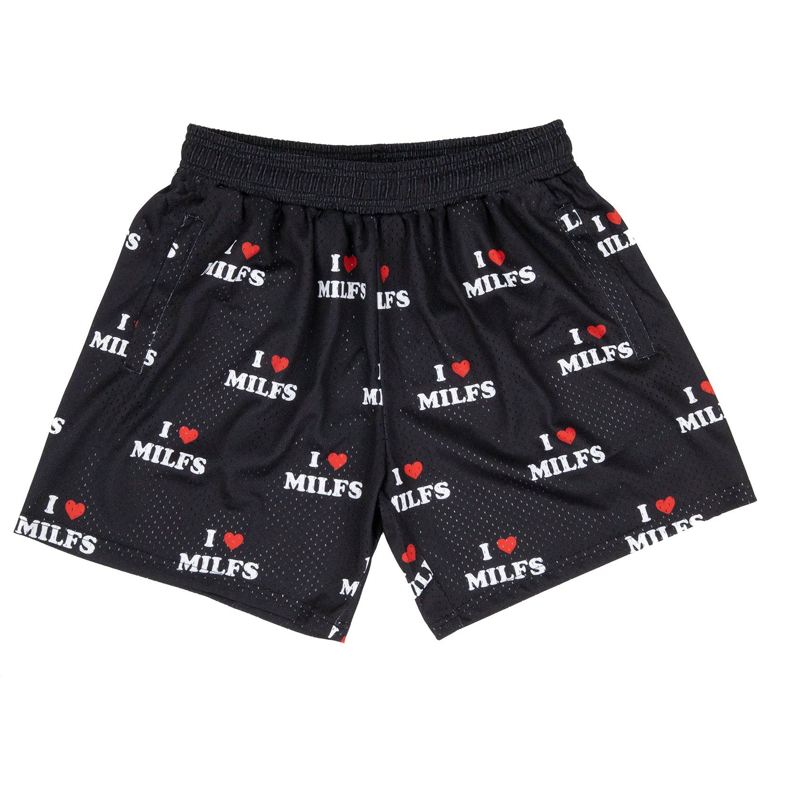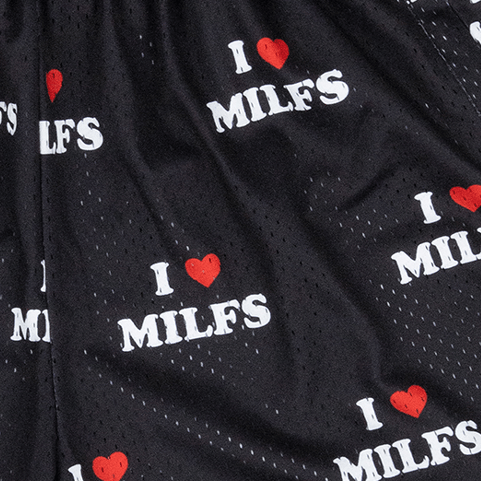 - I <3 MILFS printed in repeating pattern throughout the shorts.