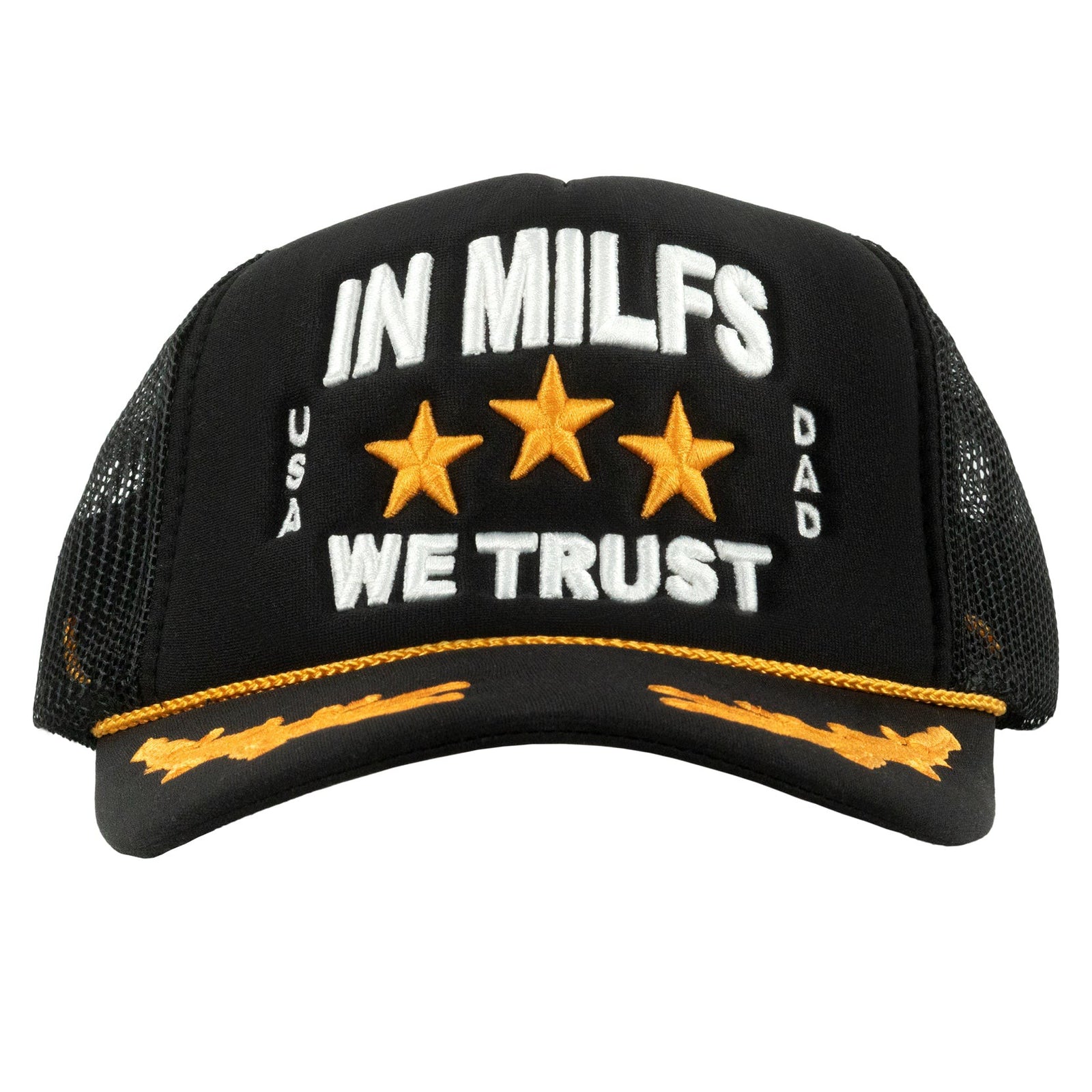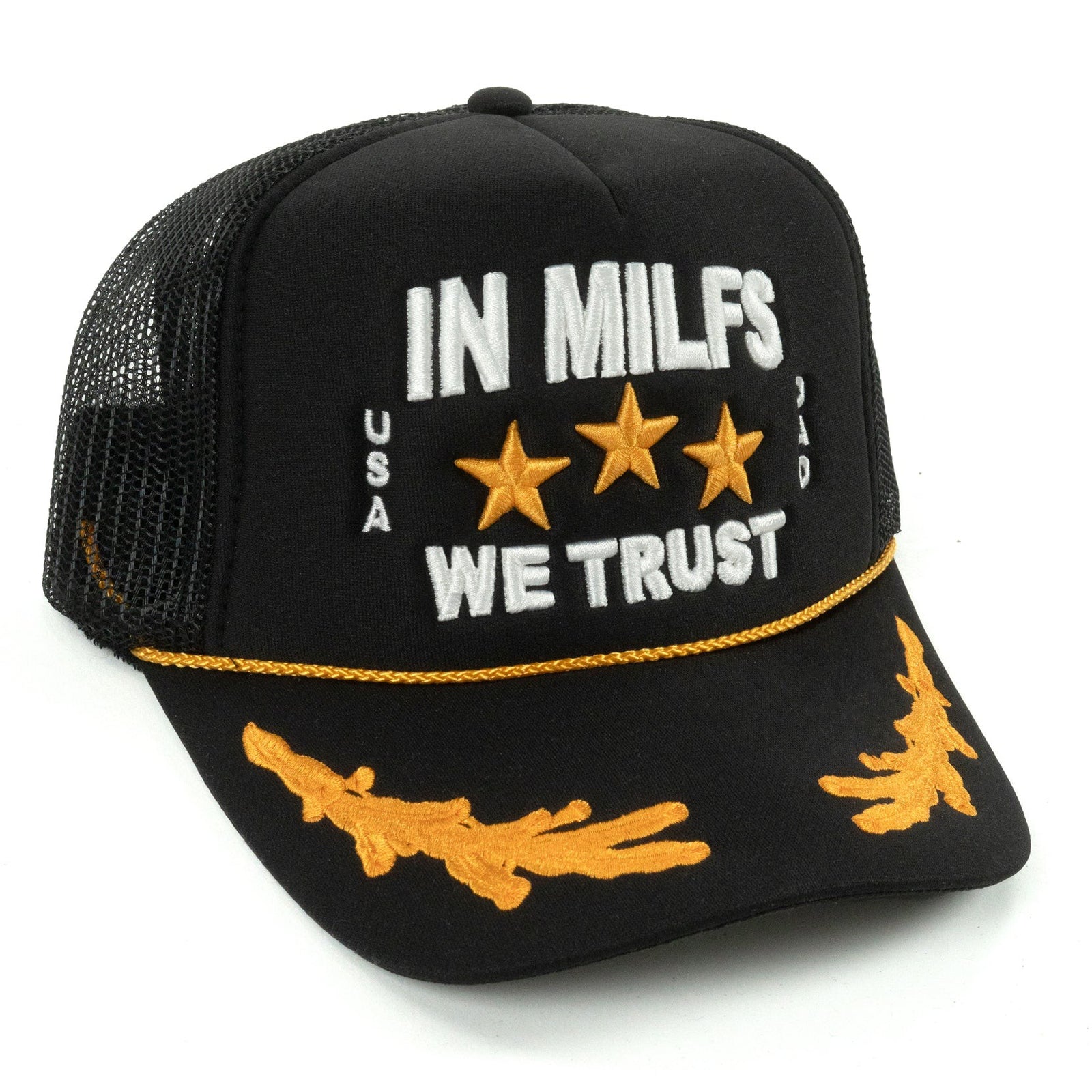 - The hat says In MILFS We Trust on it.