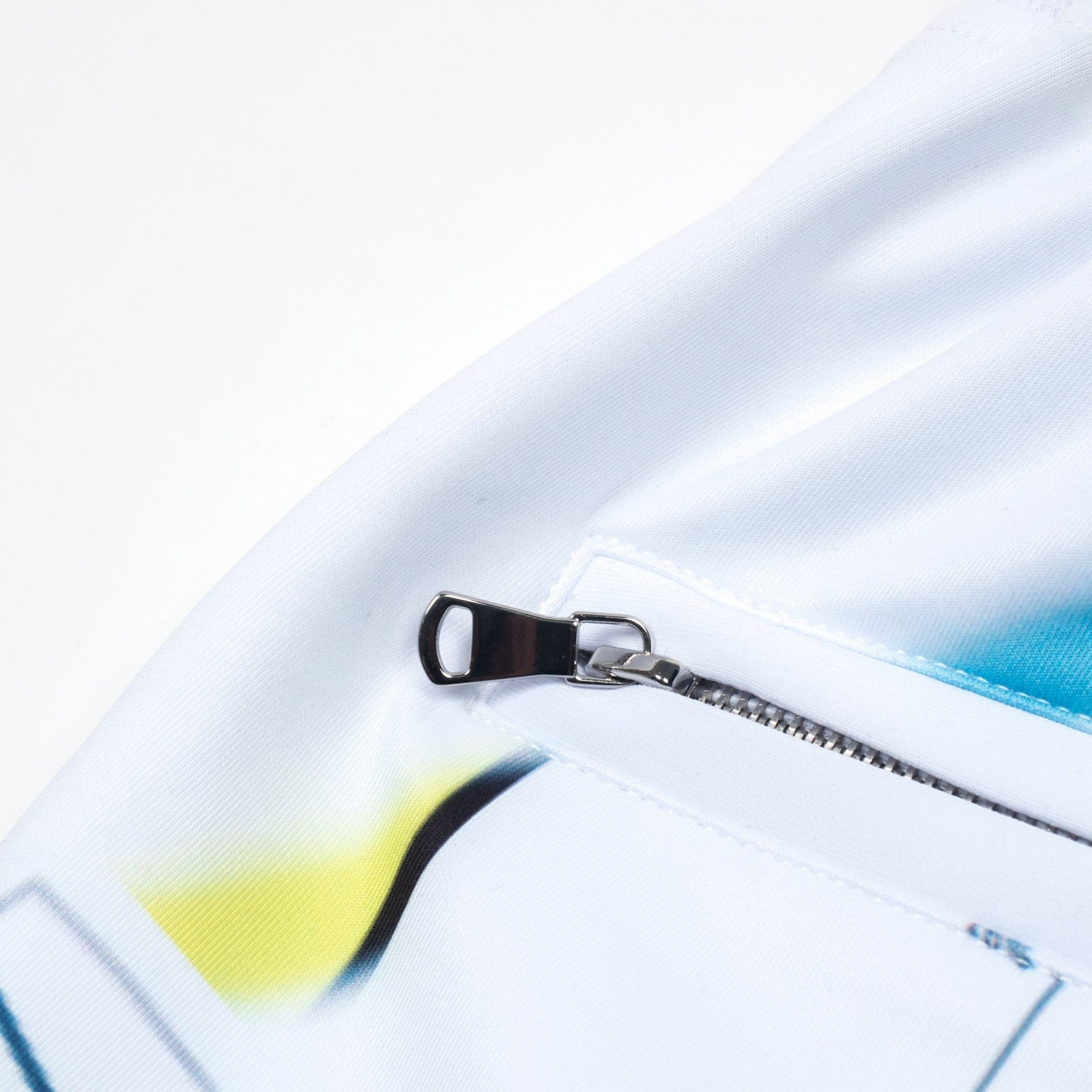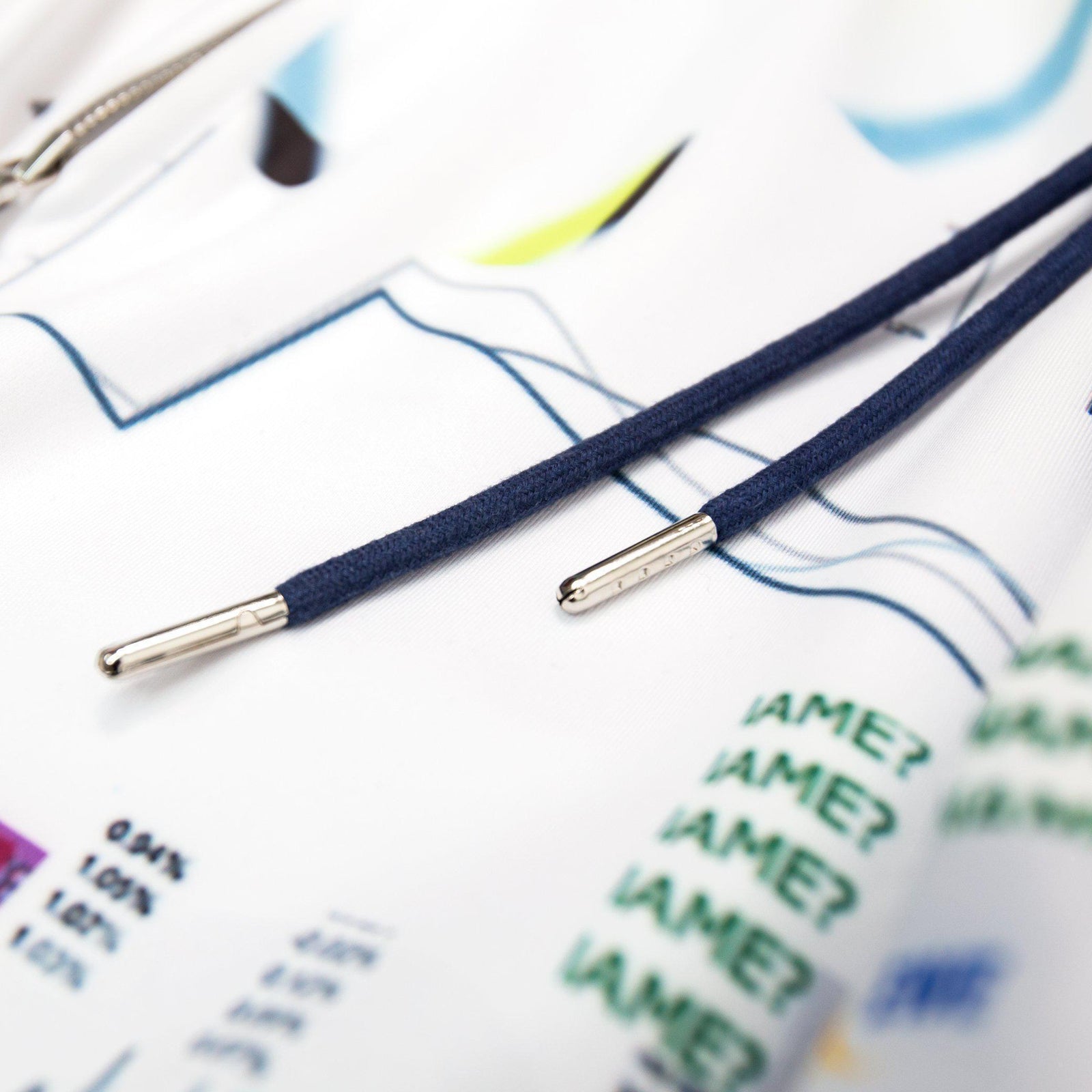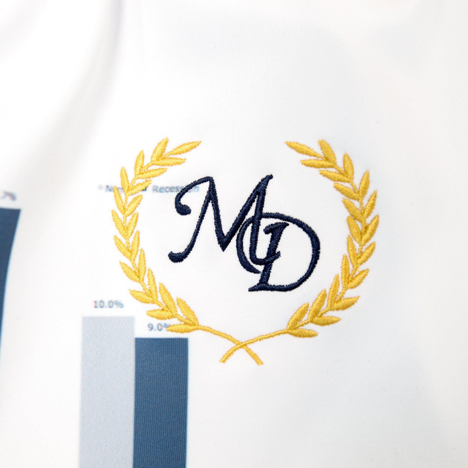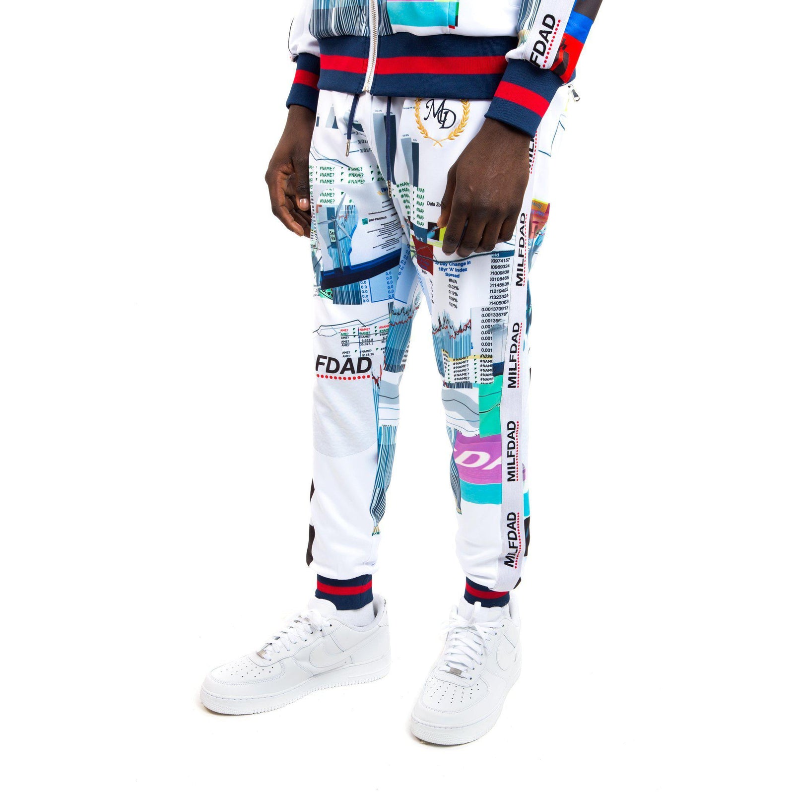 Premium poly-spandex blend track pants with drawstring and stretch waistband. Printed graphic featuring financial charts and graphics. Woven logo tape along sides, embroidered crest at thigh, and ribbed ankle cuffs featuring signature Milfdad stripe. Zip closure on front and back pockets.