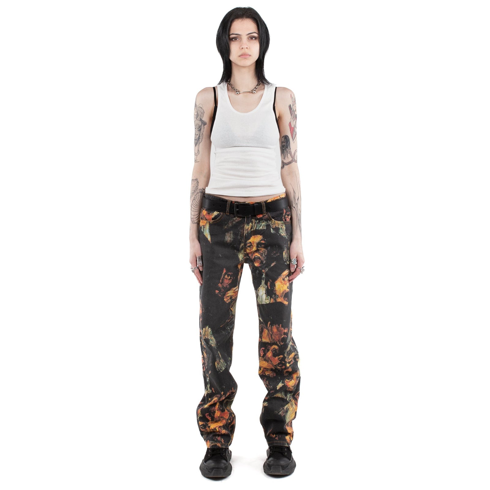 Straight leg 5 pocket denim featuring printed artwork detail from A Pilgrimage to San Isidro by Francisco de Goya. 100% Cotton fabrication, genuine leather patch. Model is 6'0 and wearing a size small.