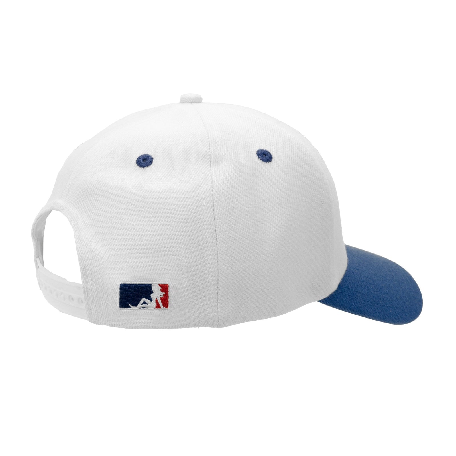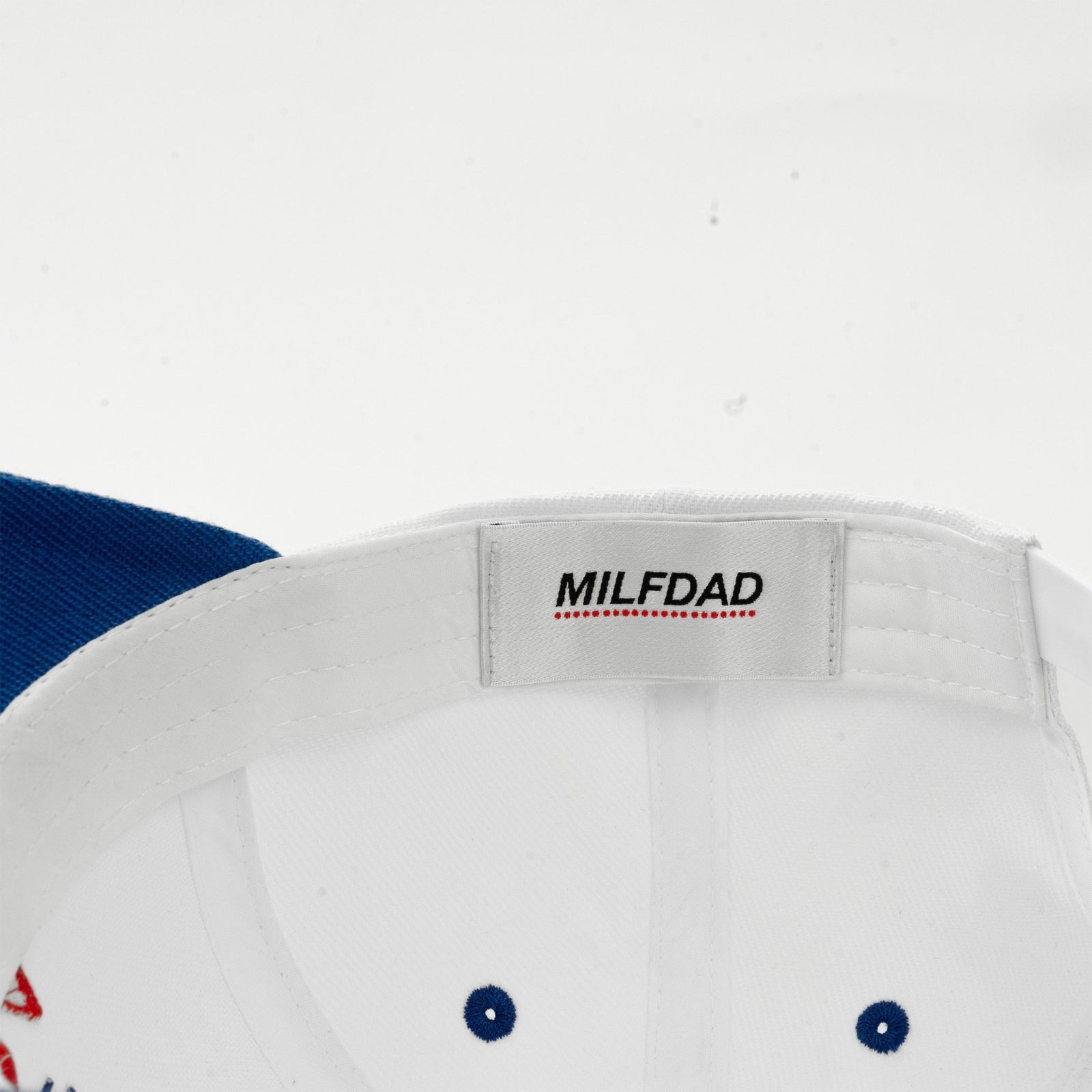 Cotton twill 6-panel hat with snapback closure. Contrast blue brim and embroidered 'Milfdad '24' logo on front.
