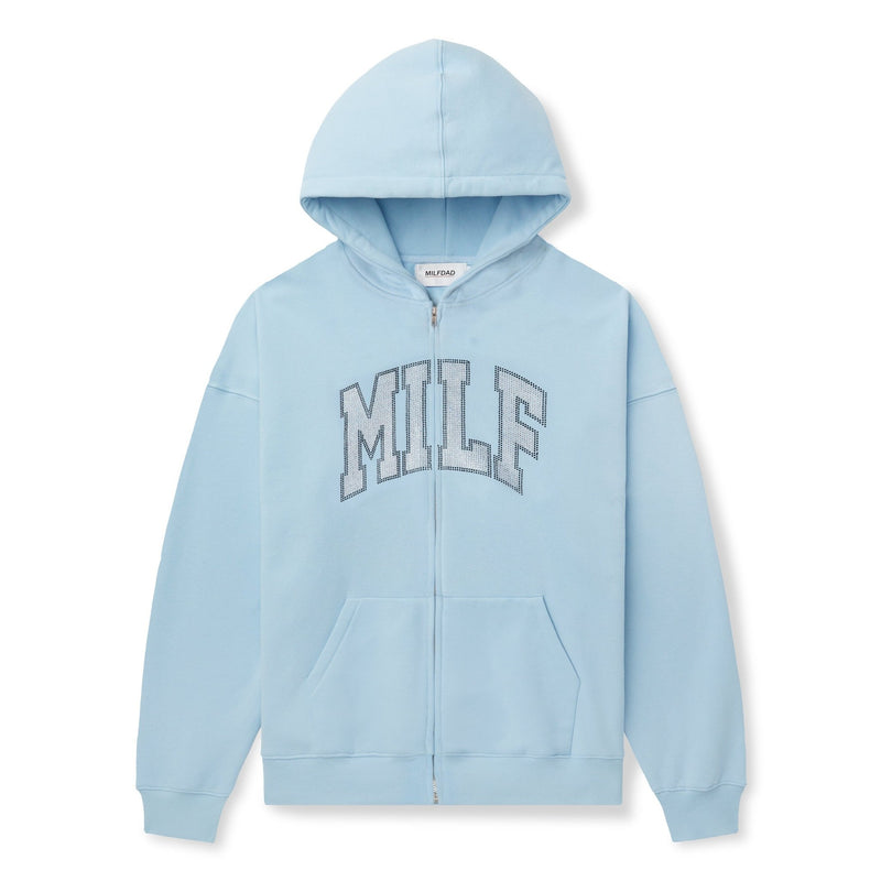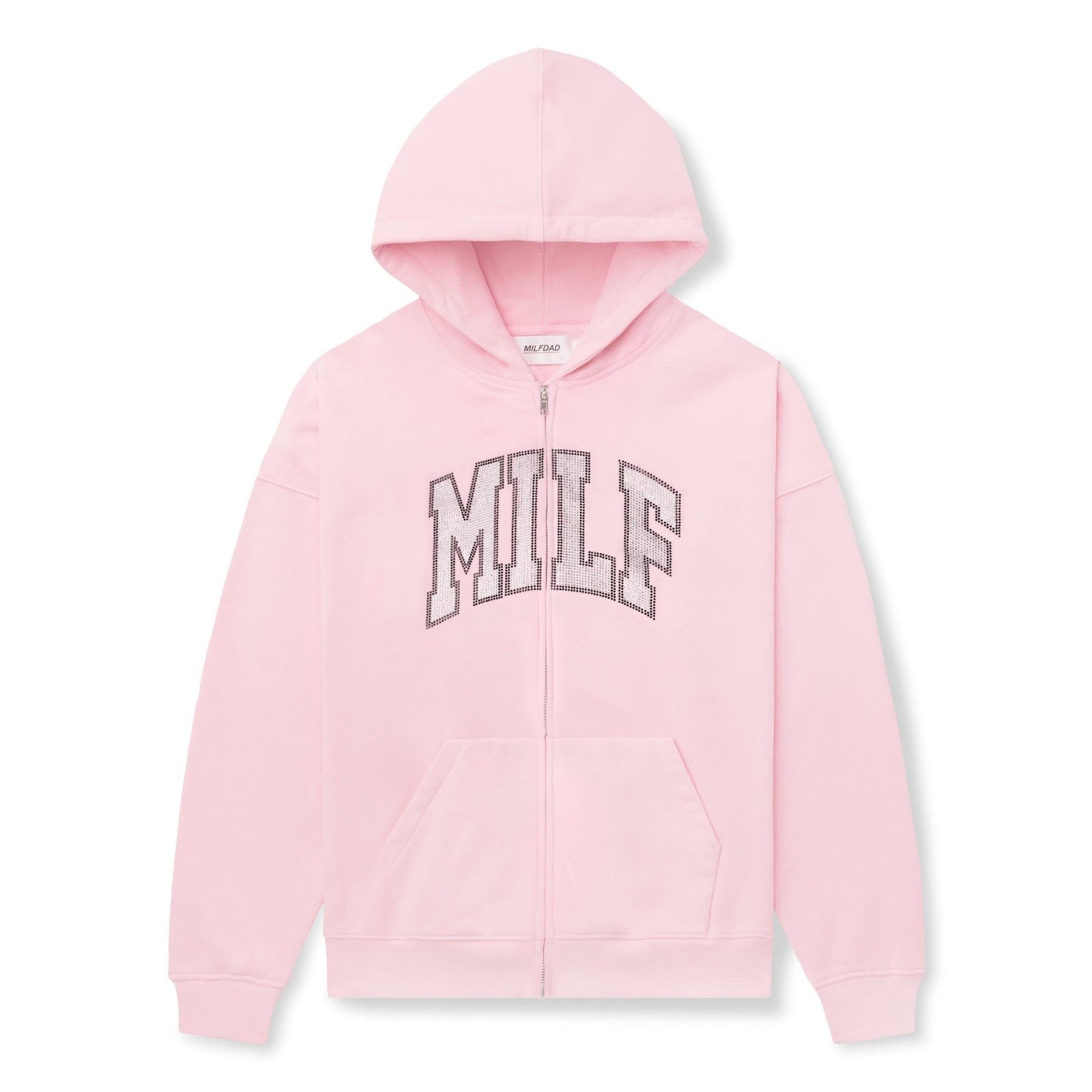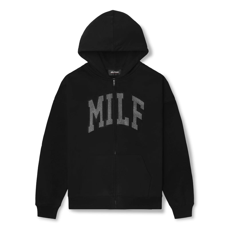 - Black zip-up hoodie with silver and black rhinestone lettering.