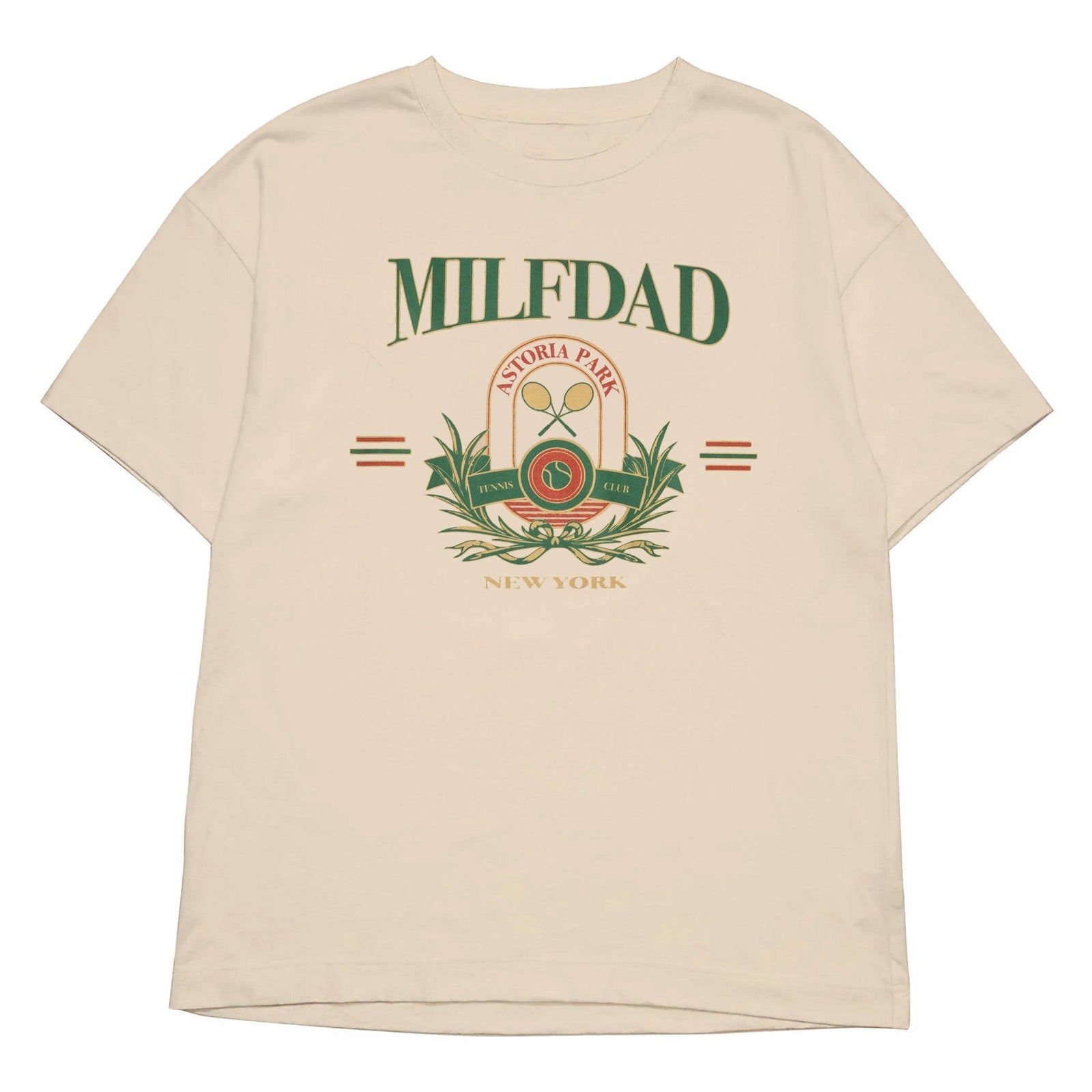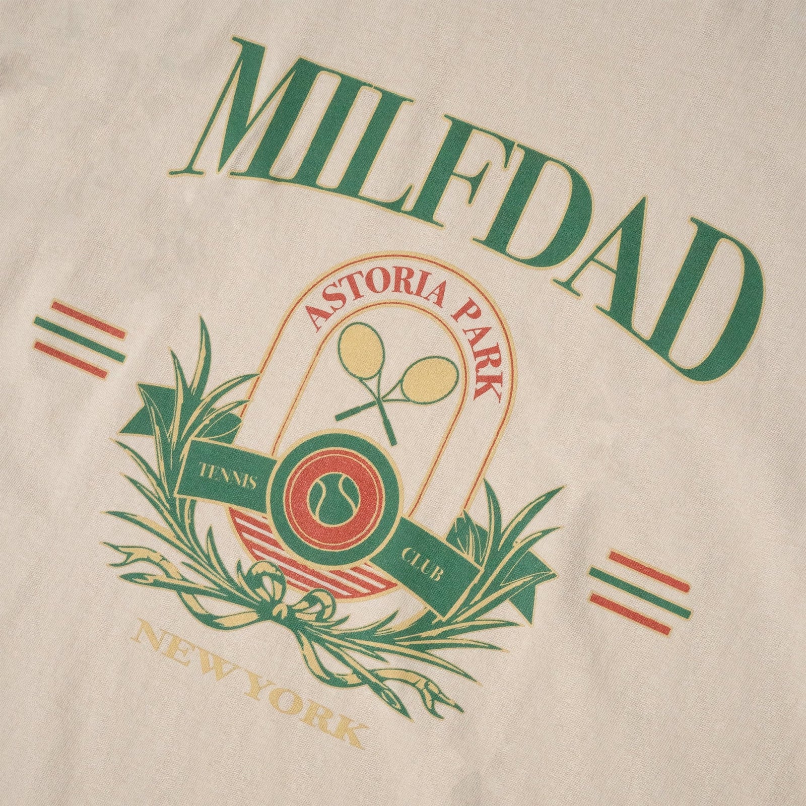 - Beige tee with screenprinted Milfdad Tennis Club graphic